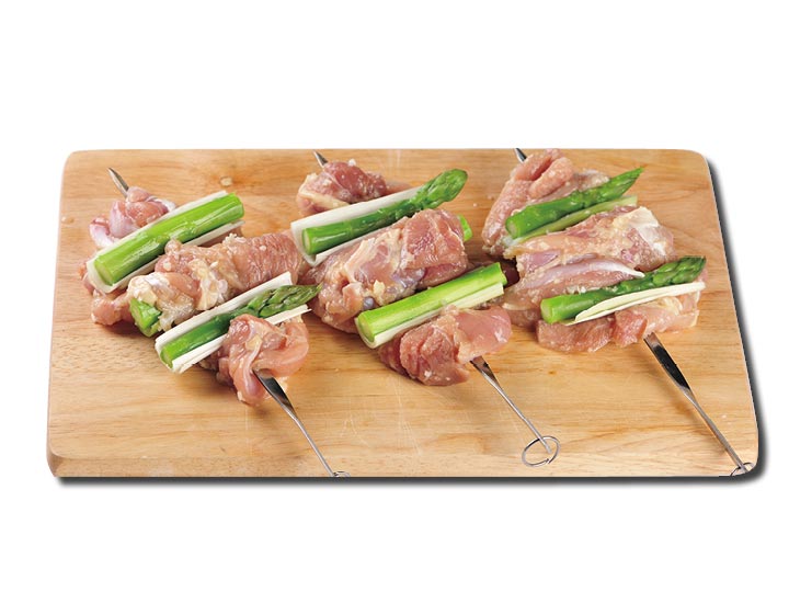 꼬치에 닭고기와 대파, 아스파라거스를 꽂고,