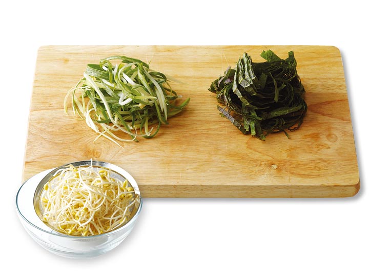 무생채, 대파, 깻잎, 고기 양념장을 올리고,