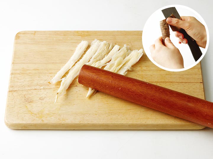 더덕은 껍질을 벗겨 밀대로 살짝