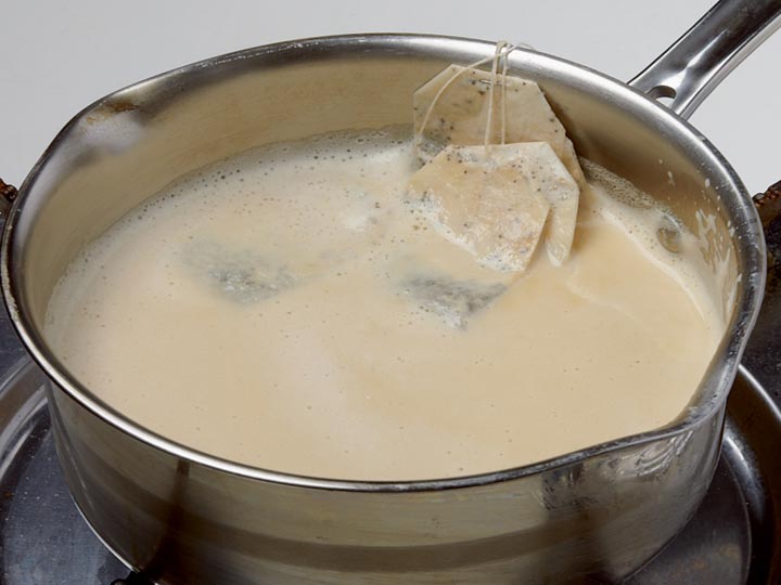가장자리에 기포가 올라오면 불을 끄고 홍차티백을 넣어 7분간 우리고,