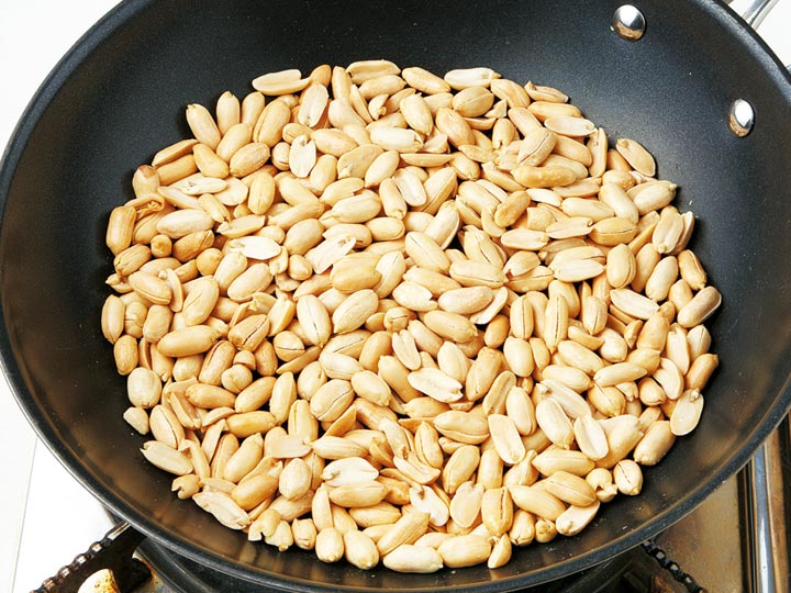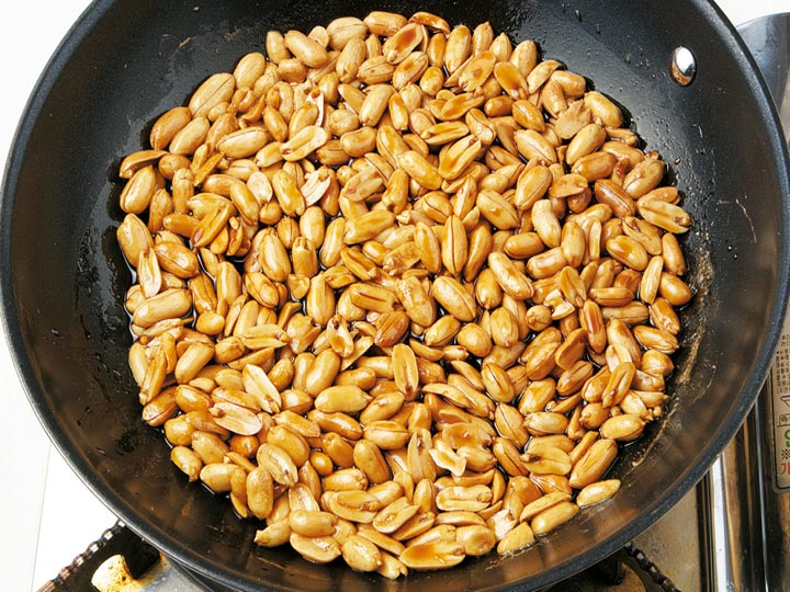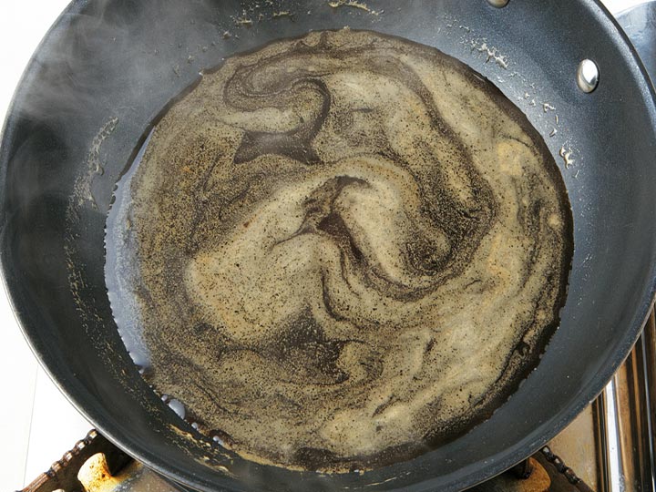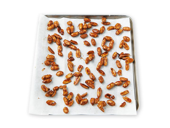 빠르게 식혀 설탕 결정을 만들기 위해 팬에서 꺼내요.